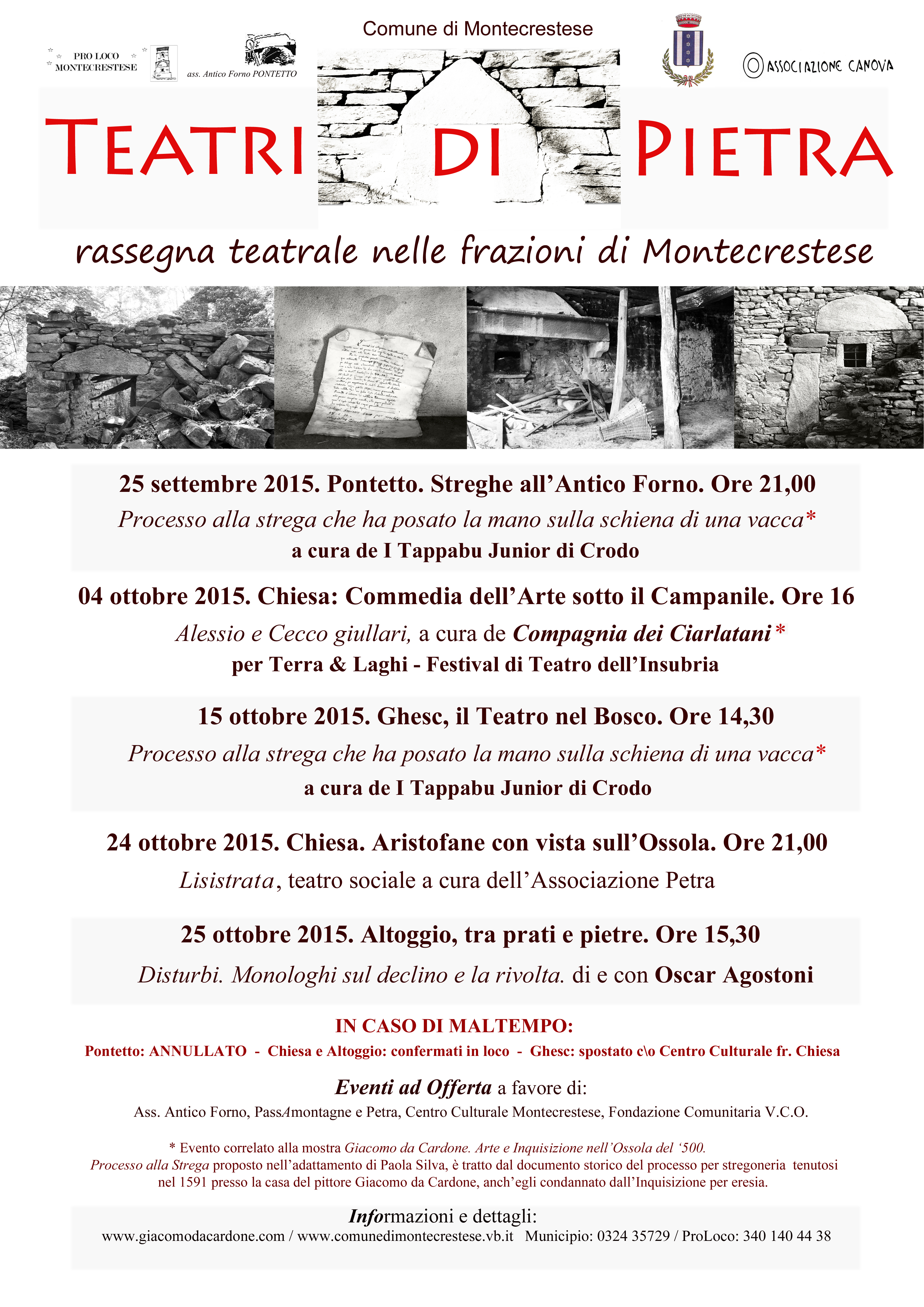 TEATRI DI PIETRA, GHESC. Lo spettacolo previsto per le 14h30 nella frazione di Ghesc è spostato alla stessa ora al Centro Culturale in frazione Chiesa: gli spalti sono bagnati ed i sentieri scivolosi. L'Associazione Canova proietterà immagini di Ghesc, illustrando le tappe di realizzazione del teatro nel bosco e la rinascita della frazione abbandonata; I Tappabu junior dopo lo spettacolo s' intratterranno con le scuole per una lezione di musica medievale con vari strumenti; siccome la stessa pièce è stata messa in scena già nella piazza dell'Antico Forno di Pontetto, rifletteremo insieme su opportunità ed emozioni che scaturiscono da diverse ambientazioni/scenografie, dal punto di vista sia del pubblico sia della troupe.